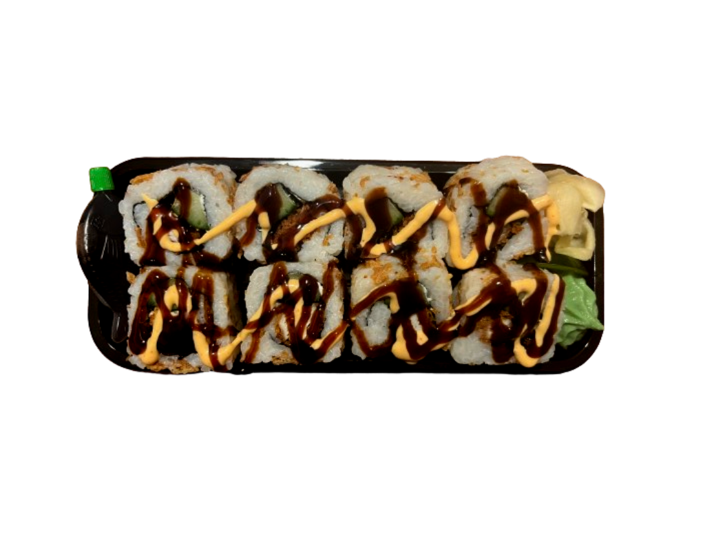 mit frittierten Garnelen, Avocado, Frischkäse, Spicy-Mayonnaise und Unagisauce